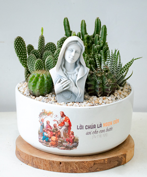Cây xanh biểu tượng cho sự sống, sức khỏe và sự phát triển, trong khi hình ảnh Chúa và lời Kinh Thánh mang lại sự bình an, niềm tin, và nhắc nhở về tình yêu thương và sự che chở của Ngài. Đây không chỉ là một vật trang trí mà còn là món quà ý nghĩa, phù hợp để tặng trong các dịp tôn giáo, mừng nhà mới, hoặc làm đẹp không gian làm việc và sinh hoạt.